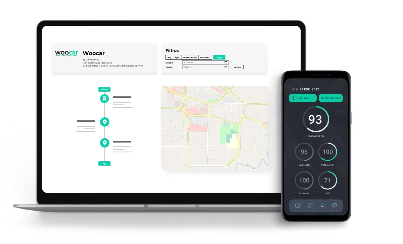 Medición de la seguridad en la conducción mediante la App Woocar: Con sólo instalarla en el teléfono medimos eventos de viaje: Uso del teléfono al manejar, Maniobras bruscas y Excesos de velocidad, resumidos en Driving Scores.